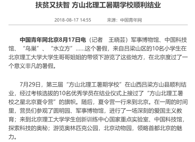 军事博物馆、中国科技馆、“鸟巢”、“水立方”……这个暑假,来自吕梁山区的10名小学生在ob真人竞猜大学生哥哥姐姐的带领下游览了这些地方,在北京度过了一个意义非凡的暑假。