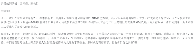 今天,我们在这里隆重举行2018级本科新生开学典礼,迎接来自全国各地的3915名优秀学子以及212名海外留学生。首先,我代表赵长禄书记,代表全校师生员工向以优异成绩考入我校的2018级新同学们表示衷心的祝贺和热烈的欢迎!你们当中,三分之二以上是新世纪诞生的“00后”,最小的只有14岁,你们的到来,为ob真人注入了新时代的青春活力!