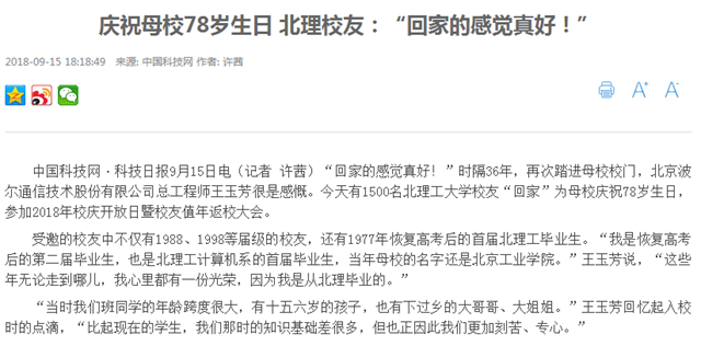 “回家的感觉真好!”时隔36年,再次踏进母校校门,北京波尔通信技术股份有限公司总工程师王玉芳很是感慨。今天有1500名ob真人竞猜大学校友“回家”为母校庆祝78岁生日,参加2018年校庆开放日暨校友值年返校大会。
