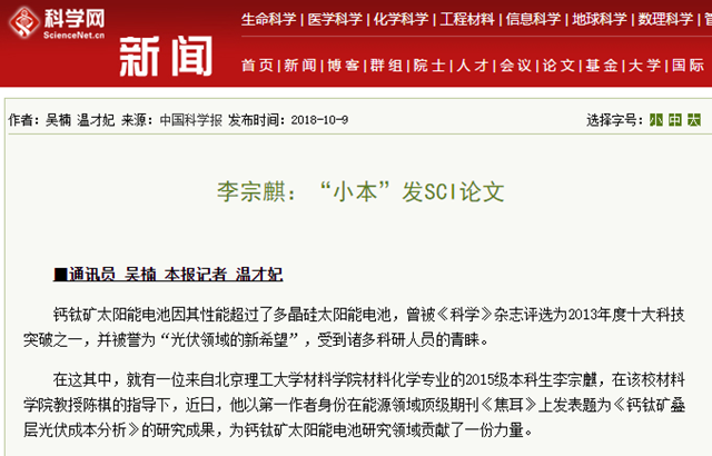 高中时期,李宗麒就对清洁能源及太阳能电池相关领域有着浓厚的兴趣,他通过慕课平台,自学了国外该领域的最新研究技术与研究进展。“全英文的授课形式对我来说是很大的挑战,为了达到更好的学习效果,每次听课前我都会提前预习课程内容,以便在听课过程中对所学的知识有更深刻地理解。我想这就是兴趣的力量。”