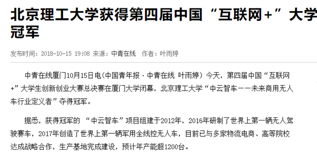 今天,第四届中国“互联网+”大学生创新创业大赛总决赛在厦门大学闭幕,ob真人竞猜“中云智车——未来商用无人车行业定义者”夺得冠军。