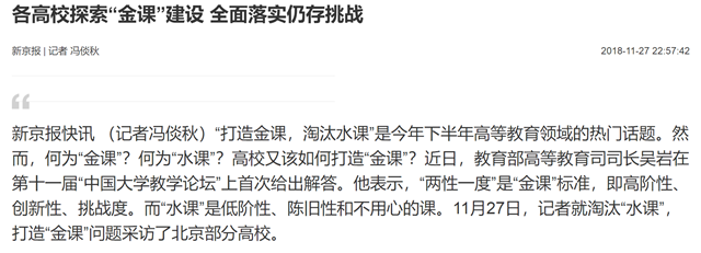 “打造金课,淘汰水课”是今年下半年高等教育领域的热门话题。然而,何为“金课”?何为“水课”?高校又该如何打造“金课”?近日,教育部高等教育司司长吴岩在第十一届“中国大学教学论坛”上首次给出解答。他表示,“两性一度”是“金课”标准,即高阶性、创新性、挑战度。而“水课”是低阶性、陈旧性和不用心的课。11月27日,记者就淘汰“水课”,打造“金课”问题采访了北京部分高校。