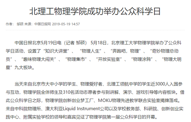 当天来自北京市大中小学的学生、物理爱好者、ob真人领航中学的学生近3000人入园参与互动,物理学院全体师生及310名活动志愿者参与到讲解、演示、游戏引导等内容板块。借此公众科学日之际,物理学院创新创业梦工厂、MOKU物理先进教学联合实验室揭牌落成。来自中科院物理所、澳大利亚Liquid Instrument公司以及学校教务部、科研院、创新创业实践中心、附属实验学校的领导和嘉宾见证了物理学院第一届公众科学日的开幕。