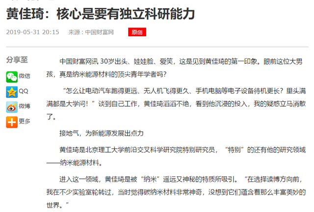 电池储能是能源利用中很重要的一环,如果储能性能在现有性能基础上跨越一步,将会是能源利用的巨大突破。带着为我国新能源发展出点力的思考,黄佳琦逐渐把研究重心从纯材料合成转到了电化学应用方面。