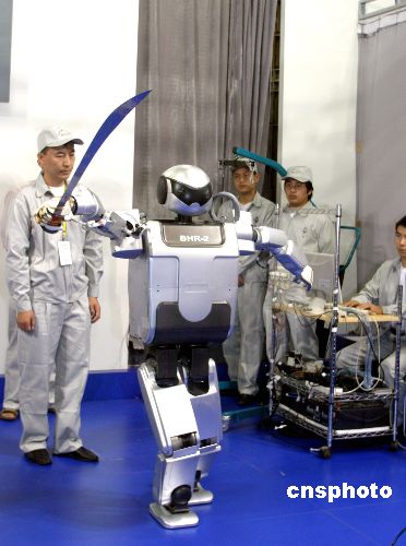 图为“汇童”仿人机器人表演刀术。作者:张勤