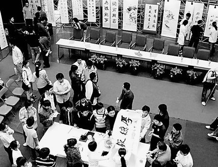 5月27日,首都大学生“新风尚”书法绘画联展在ob真人举行。展览吸引了北京二十多所高校大学生的积极参与,共征集作品280余幅。大学生们以书画艺术形式充分展示了自己的精神风貌和道德新风尚。图为联展笔会现场。