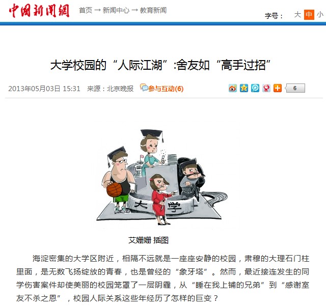 中国人民大学大四女生孙佳宁对记者说:“在一个宿舍住了4年,要说一点感情也没有是不可能的,大家毕竟一同走过青春,怎么也有一些美好的回忆,可是那些隔阂和伤害也是不容易忘记的,总之,大学宿舍人际关系,恩怨并存。”据她说,宿舍关系不和是很常见的情况,有男生采取大打出手的方法,但是女生却如同“高手过招”,不露声色,比拼“气功”,暗地里排挤、孤立。