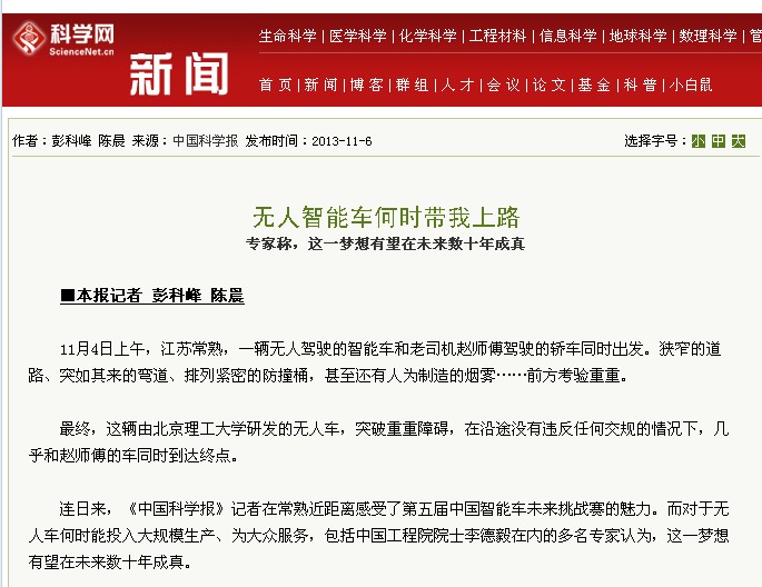 他向记者预测了中国智能汽车应用的时间表:2020年实现结构化道路的智能行驶,2030年实现城市道路等半结构化道路的智能驾驶,2050年实现战场、沙漠、沼泽等非结构化道路的智能驾驶。