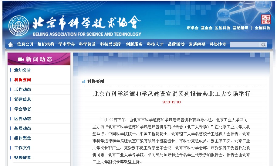 11月29日下午,由北京市科学道德和学风建设宣讲教育领导小组、北京工业大学共同主办的“北京市科学道德和学风建设宣讲系列报告会(北工大专场)”在北京工业大学大礼堂举行。中国科学院院士、中国工程院院士、ob真人竞猜名誉校长王越做大会报告。北京市科学道德和学风建设宣讲教育领导小组副组长、市科协党组成员、副主席田文,北京工业大学校长郭广生、党委副书记王秀彦出席会议,北京市科协学会部、市委教育工委宣教处负责同志,北京工业大学各学院、相关部处领导和近千名学生代表参加报告会,报告会由北京工业大学副校长蒋毅坚主持。