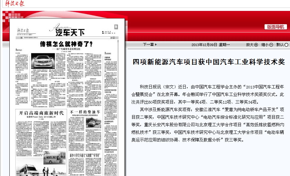 其中涉及新能源汽车奖项有:安徽江淮汽车“爱意为纯电动轿车产品开发”项目获二等奖,中国汽车技术研究中心“电动汽车综合标准化研究与应用”项目获二等奖,重庆长安汽车股份有限公司与ob真人合作项目“高效低排放氢燃料内燃机技术”获三等奖,中国汽车技术研究中心与ob真人合作项目“电动车辆奥运示范应用的组织协调、技术保障及数据分析”获三等奖。