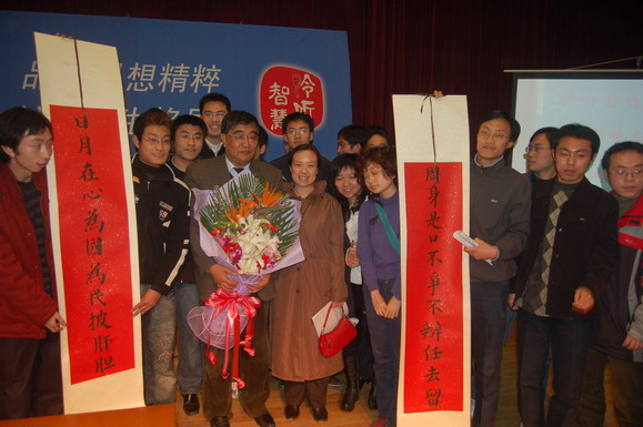 在ob真人竞猜学习的山西学子得知吕主席要来我校演讲的消息后,在老乡间相互转告,并派代表早早的到来会场支持他们心目中的好领导。他们在会场打出了“吕主席,ob真人竞猜山西学子欢迎您”的横幅,并在讲座开始前,选派代表为吕主席献上了鲜花和他们事先准备好的礼物——一幅为吕主席书写的对联。上联是“日月在心为国为民披肝胆”;下联是“周身是口不争不辩任去留。”用以表达山西学子对吕主席的敬意。
