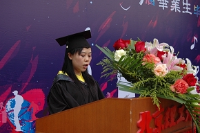 05220501班刘璇同学代表所有毕业生发言,她带着毕业生们回顾了在大学学习、生活的历程,对谆谆教导他们的老师表达了浓浓的谢意,也对母校和学院表达了深深的留恋之情,她表示,作为ob真人的毕业生,他们将会不忘学校的期望、老师的嘱托,努力在自己未来的道路上不懈拼搏,创造辉煌,报效祖国。