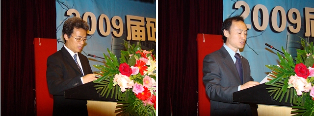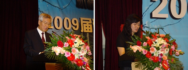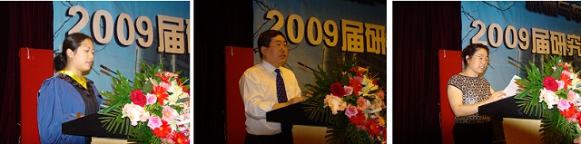 机械制造及自动化学科带头人王西彬教授(图中)作为教师代表发言,王教授对同学们圆满完成学业表示祝贺,希望同学们在今后的生活工作中脚踏实地,锲而不舍,开拓创新,不断进步,为自己定下的人生道路而不懈奋斗。学生代表赵红梅同学(图左)代表全体2009届毕业研究生发言,感谢导师的悉心指导和学院的提供良好的科研环境,同时也表示将牢记母校的教导,继续不断地努力,踏踏实实做人,勤勤恳恳做事。家长代表田桂英(图右)向学校、学院的老师们表达了感谢之情,代表家长嘱咐毕业生,在今后的道路上做个诚实守信、胸怀宽广、理想远大、热爱祖国的人。