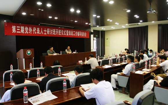 7月16日,我校在研究生搂101室举行第三期党外代表人士研讨班开班仪式暨统战工作辅导报告会。参加会议的有:本期研讨班学员(包括各级政协委员、人大代表在内的校级党外代表人士)、各分党委书记、统战部、组织部(党校)、宣传部负责人、及分党委负责统战工作的干事。党委副书记侯光明出席会议并发表讲话。