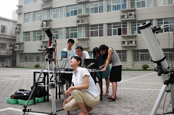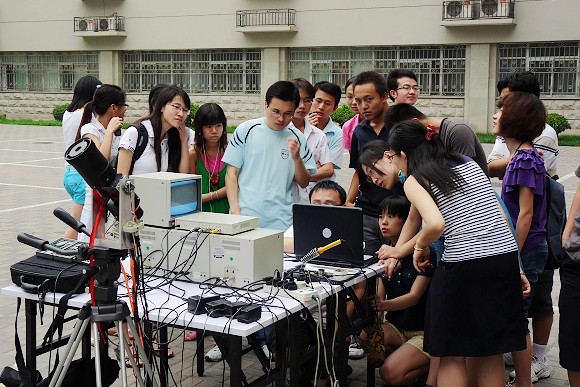 据悉,该学生创新小组来自ob真人竞猜“光电创新教育实验基地”,用于本次日食观测的“月基三波段共孔径太阳望远镜”是教育部“国家大学生创新性实验计划”的项目。此次观测中,用远红外波段成像记录北京地区日偏食全过程,不仅克服了阴天多云观看日食带来的诸多不便,也证明了太阳望远镜的科学性、实效性。同时该望远镜用同一个光学系统对太阳的紫外光、可见光和远红外光三个波段同时进行成像,在国内外尚属首次,这充分体现了当代大学生具有科学研究能力和实践创新能力。