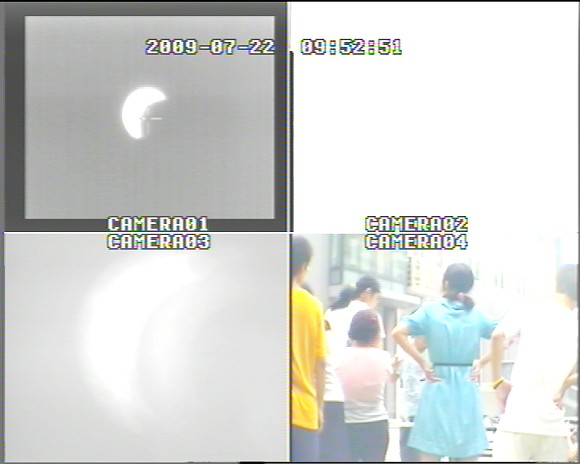 一大早小组成员便开始装配、调试仪器,八时许一切准备就绪,等待观测,同时小型观测站的建立也引来众多看客。初始由于阴云遮挡,无法确定太阳位置,八点半左右,云层变薄,人们可以用肉眼观看到太阳,小组成员迅速定位镜筒,用远红外,可见光,紫外光三个波段同时进行观测并录像。大约十分钟后,云层再次遮挡,偏食已无法用肉眼观看,仪器的可见光波段也无影像,但此时仪器的远红外波段可观看到清晰的日偏食图像。阴云的遮挡影响了日食观察,但通过先进科学仪器随时了解偏食的变化过程,不禁使人们感到惊叹。随后的时间,通过不断地跟踪定位,小组成员利用太阳的远红外波段热成像记录了日食全过程。
