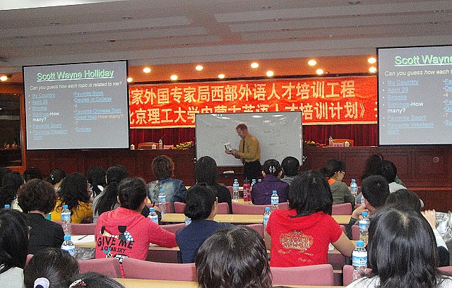 开班仪式结束后,外籍教师Scott Holliday先生开始了为期三天的《口语教学》培训。在未来两个月里,还安排了《写作教学》和《英美文化教学》培训。