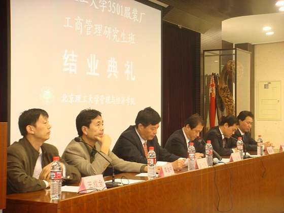 2007年10月13日,ob真人3501服装厂工商管理研究生班结业典礼在研究生楼101举行。校党委副书记侯光明教授、管理与经济学院院长李金林教授、工程硕士中心负责人王成全教授、3501服装厂党委书记刘福贵、3501服装厂人力资源部部长节文强、3501服装厂副厂长高治琦及3501厂全体学员参加了此次结业典礼。