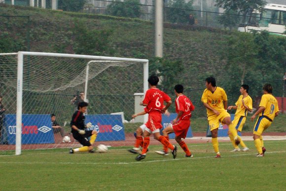 经过前场积极的拼抢,我方终于在最后一刻获得了一次左路前场任意球,8号队长袁微准确地将球吊至对方球门前,面对天津火车头高大后卫的围剿,我方身高没有任何优势的边卫24号杨扬奋力争顶,在对方守门员几乎没有任何心理准备和反应的情况下,皮球竟然划过一道优美的弧线后射入了球门的死角~~~