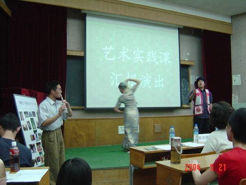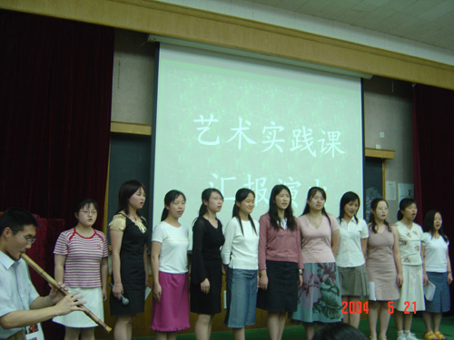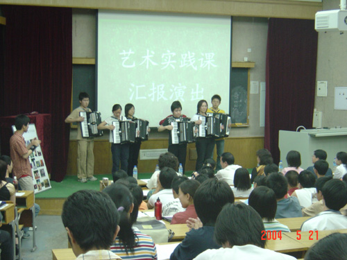 5月21日晚,在7号教学楼108教室举办了一场不同寻常的晚会 - 艺术类选修课汇报演出。这次活动由艺术教育中心主办,校教务处闫达远副处长及部分教务处老师应邀出席,参加演出的所有演员均是选修本学期通识教育选修课《名家名曲欣赏与演唱》、《手风琴入门》、《名家论坛--文化艺术系列讲座》三门艺术类课程的普通学生。同学们表演的节目丰富多彩,形式多样,包括男女声小合唱、二重唱、男女声独唱、手风琴合奏等,并有10位同学穿插进行了即兴演讲。演出结束后,闫达远副处长代表教务处感谢同学们的精彩表演和指导教师的辛勤劳动, 带给在场的所有观众一个美好的夜晚。