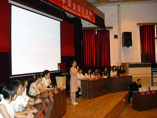 安全生产知识竞赛活动是我校今年“安全生产月”系列活动之一,也是我校举办的第一次由广大师生参与的现场抢答式安全知识竞赛,此次活动由实验室设备处主办、材料科学与工程学院承办,共有我校机电工程学院、材料科学与工程学院、化工与环境学院、生命科学与技术学院、理学院等五个学院选派的24支代表队的72名师生进行了认真备战和积极参与。通过这次活动,达到了“传播安全文化、宣传安全知识”的目的,进一步增强了参与者的安全生产意识和技能,取得了预期的效果。