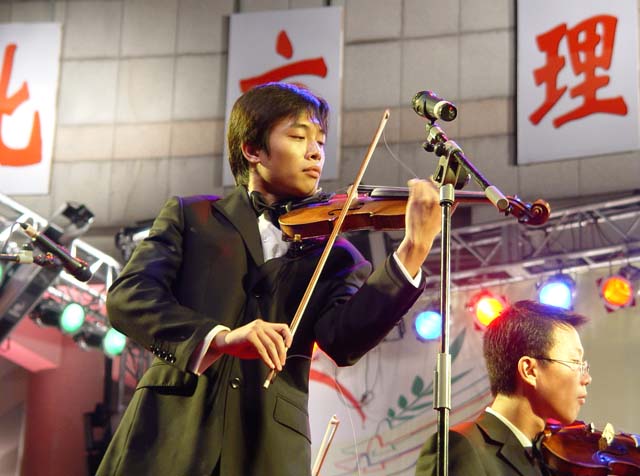 由学生艺术团交响乐团团长周考同学领奏的小提琴协奏曲《梁山伯与祝英台》选段,包括“草桥结拜”、“英台抗婚”、“坟前花蝶”三个主要情节,表现了这对青年男女的忠贞爱情和对封建宗法礼教的控诉和反抗。最后化蝶的描写富于浪漫主义色彩,反映了人民的愿望与理想。