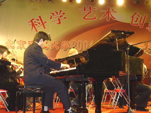 由学生艺术团键盘乐团团长常浩同学领奏的钢琴协奏曲《黄河》选曲,首乐章《序曲——黄河船夫曲》以磅礴气势展开黄河上船夫与波浪搏斗的情景。第二乐章《黄河颂》描绘黄河与中原大地的美丽景色。乐曲逐渐加以展开,层次与力度逐渐加强,终于形成歌颂性高潮,以强有力的和弦终结全曲。终曲《保卫黄河》以铜管乐奏出了短促庄严的引子,带出钢琴的华彩乐段,庄严雄浑的曲调营造出一个恢宏气势的胜利高潮,终结全曲。