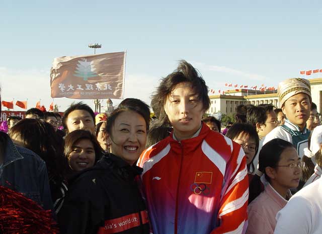 与奥运冠军同看升旗,激动心情溢于言表。