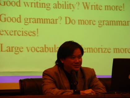 随后,刘宁老师为学生进行四级英语考前辅导。刘宁老师从考试心态、思想准备、应试技巧、学习方法、常见问题等方面向同学们作了认真的讲授,刘老师生动的语言、丰富的内容、精湛的技巧和轻松幽默的风格赢得了同学们阵阵掌声,同学们对刘老师讲到的知识要点作了认真的记录。