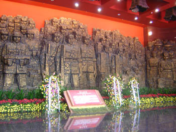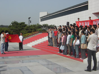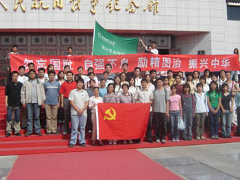 为了纪念抗日战争胜利60周年以及“九·一八”事变74周年,贯彻爱国主义教育,增强学生的爱国信念,提高民族凝聚力和自豪感,给同学们上一节生动详实的形式政策课,同时恰逢中秋,让新生欢度佳节,培养集体意识,增进相互了解,2005年9月18日,设计艺术学院分团委组织所有05级本科新生和研究生党员在卢沟桥抗日战争纪念馆进行了一次主题爱国主义教育活动。