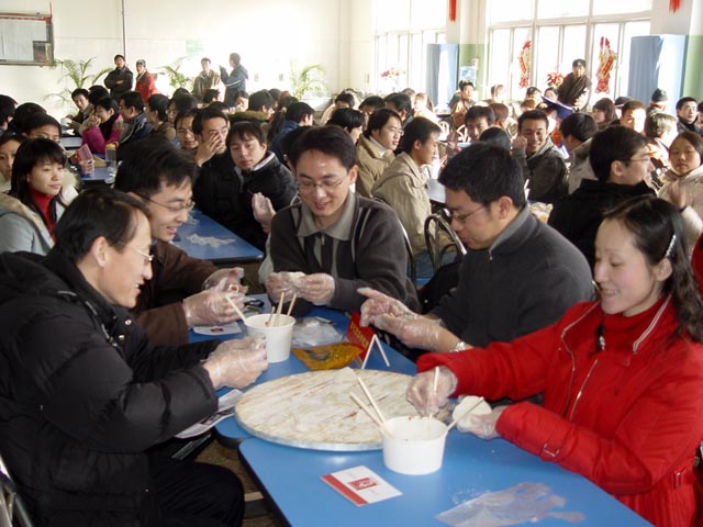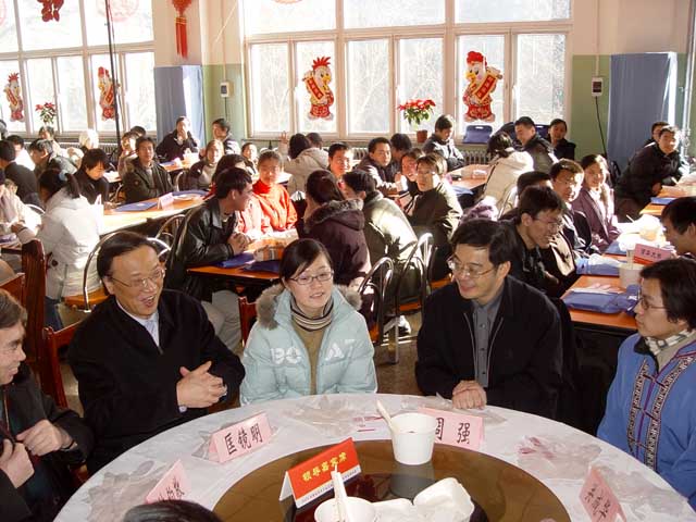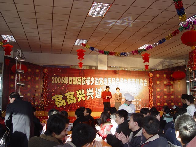 来自16所首都高校因经济困难等原因而留在北京过年的大学生代表欢聚在ob真人,共度2005年新春。食堂成了一片欢乐的海洋,张灯结彩,大红灯笼高高挂在舞台两侧。