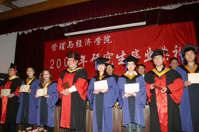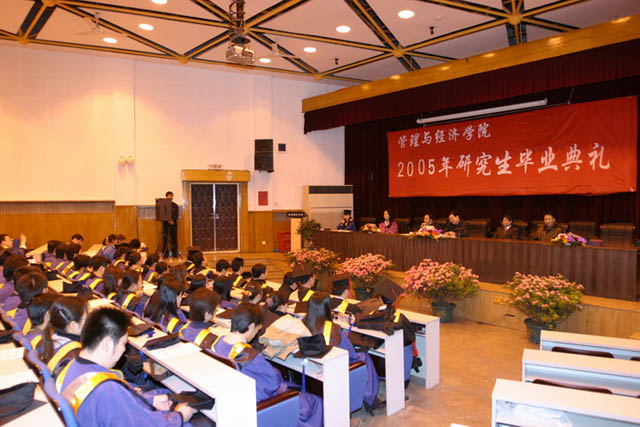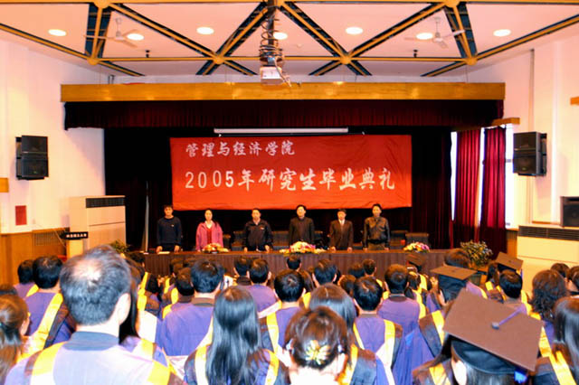 2005年3月23日下午2:00,在七号楼报告厅举行了隆重而热烈的“管理与经济学院2005届春季研究生毕业典礼暨学位授予仪式”。管理与经济学院党委书记李波,副书记汪本聪,副院长吴祈宗,副院长纪新华等领导出席了典礼,管理与经济学院全体春季毕业博士、硕士研究生近110人参加了毕业典礼。
