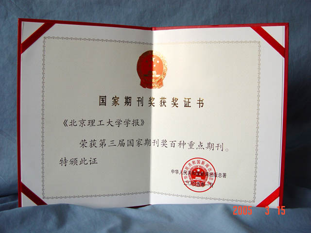 2005年2月28日,新闻出版署在北京隆重召开国家期刊奖颁奖大会。《ob真人学报》(自然科学中文版)荣获第三届国家期刊奖“百种重点期刊奖”。这是该刊继获首届国家期刊奖“提名奖”、第二届国家期刊奖“百种重点期刊奖”后第三次荣获国家级期刊奖。