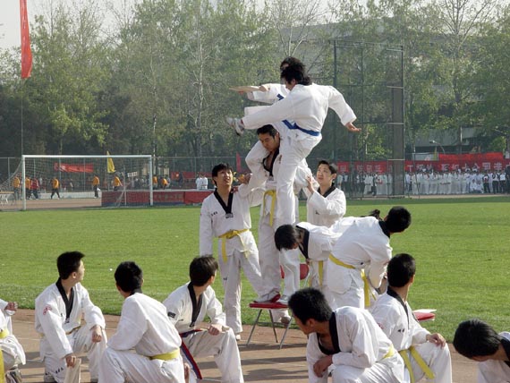 各单位运动员方队以独具特色的创新表演方式入场,展现了他们的新风貌。由校大学生轮滑协会、跆拳道协会编排的精彩表演赢得阵阵掌声;400名教师太极剑表演翩翩起舞,刚柔相济;450名大学生功夫扇表演气势磅礴,整齐划一。 比赛中,运动员们发扬了更高、更快、更强的奥林匹克精神,经过激烈的角逐,共有26人次在9个项目上打破校运动会纪录,其中高水平组运动员王燕打破我校13年的女子铁饼运动纪录,普通学生组化工与环境学院学生王一飞一分钟跳绳达到249个、打破普通组校纪录成为运动会亮点。最后,1院、4院、5院、6院、8院和9院荣获精神文明奖,8院、1院、6院、7院、5院、3院、高职学院和9院荣获学生组团体总分前八名,8院、2院、直属、后勤、机关和1院荣获教工组团体总分前六名,。 闭幕式后,北京红灯足球俱乐部足球队(全国足球乙级队)与我校大学生足球队进行了精彩激烈的足球表演赛。