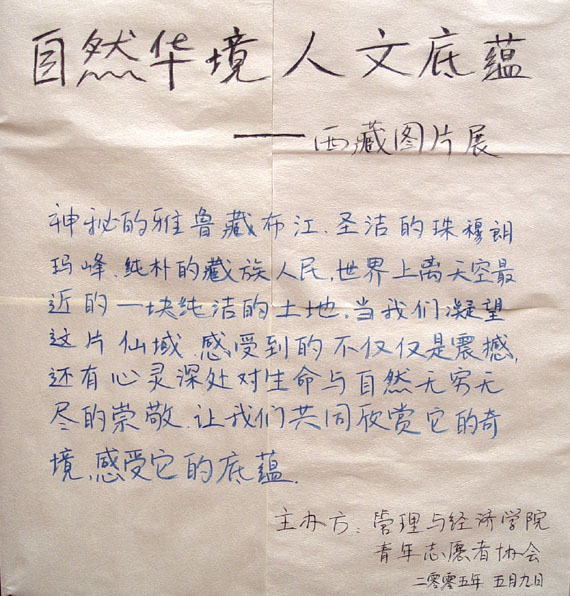 由管理与经济学院青年志愿者协会组织的“自然华境 人文底蕴”--西藏图片展目前正在中教大厅举行。