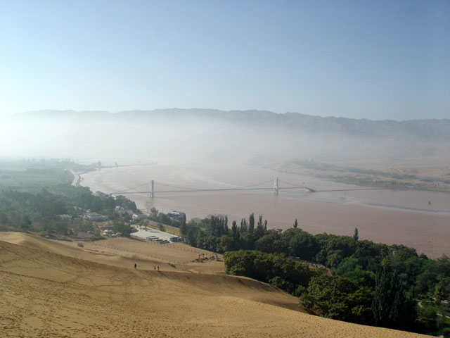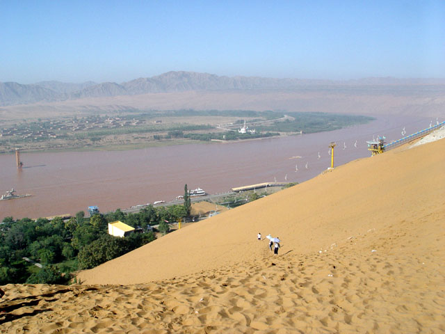 从沙丘顶部到黄河之滨,依次镶嵌着郁郁葱葱的固沙林带,花格地毯般的金黄屏障和翡翠玛瑙般的果木园林,衬托着掉头转向的滔滔黄河以及沙丘上平行延伸的包兰铁路与绿色长城,构成了层次分明、绚丽多姿的大漠黄河奇景。
