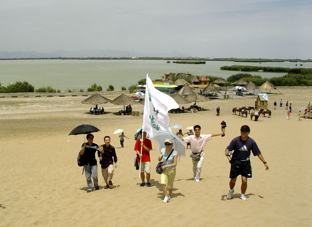 沙湖南沙北湖,湖润金沙,沙抱翠湖。湖水如海,柔沙似绸,天水一色,苇丛若画的沙湖,犹如一颗璀璨的明珠,镶嵌在美丽富饶的宁夏平原上,沙湖以自然景观为主体,资源蕴藏量丰富,“沙、水、苇、鸟、山、荷”六大景源有机结合,构成独具特色的秀丽景观。