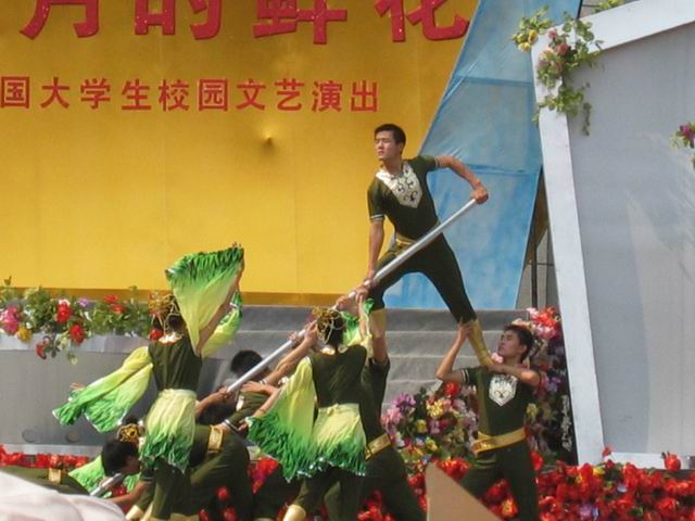 我校的节目《让梦飞翔》一开始,就点亮了全场观众的双眼,也点燃了场内的激情,所有的观众都起立喝彩,帽子、旗帜在场中飞扬,我校艺术团毕霏琳、葛笑、耿玮芯、孙迪和宋琛同学把整场演出的气氛带到了最高潮。