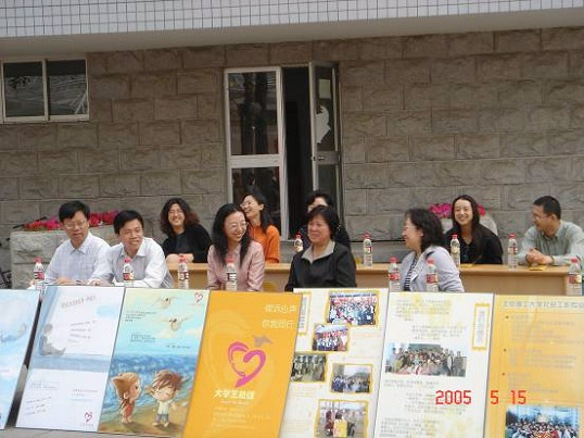 校、院领导和社会工作专业教师在人文学院举办的“社工文化节”开幕式上。宣传“大学生热线”是“社工文化节”的重要内容之一。