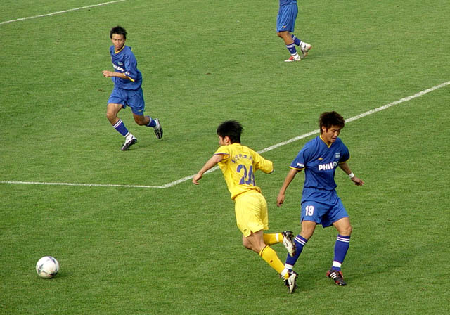 上半场一开局,东华就显示了自己强大的实力,进攻打得非常犀利,给ob真人的后卫形成了巨大的压力,频频在ob真人的禁区制造险情。东华的攻势很快就收到了成效,在第10分钟的时候,东华的场上队长7号黄洋利用角球,在混乱中头球将皮球送进了对方的大门。随后东华一度占据着场上的主动,拼抢很积极,并且多次利用个人突破威胁ob真人的球门。ob真人的中场断球技术很好,脚下技术非常娴熟,多次阻截了对方的精彩配合,打了几个反击,可是并没有破门得分。比赛进行到将近20分钟的时候,东华的7号球员梅开二度,他利用中路传中,再次用头球将比分扩大。随后东华注意稳固后防,一直没有给ob真人留有机会。