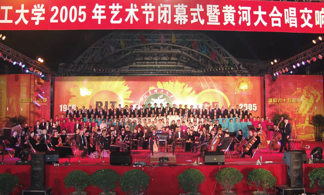 今年适逢抗日战争胜利60周年,作为艺术节的重要内容之一,黄河大合唱交响音乐会以纪念抗战为主题,吸引了众多师生参与。参加演出的有我校大学生交响乐团、合唱团、延河合唱团、教师合唱团等,气势恢宏,催人奋进。
