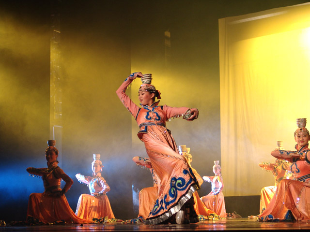 蒙古族女子群舞《顶碗》取材于传统的舞蹈形式,但创作中却融入了许多现代舞蹈的新动态语汇,使之在视觉上不但美观大方,在技术技巧上也变得高难和复杂。该作品有意淡化作品的情节性,突出传统舞种的形式美,力图将传统民族舞蹈形式挖掘到极致,表达了少女们喜悦的心情。