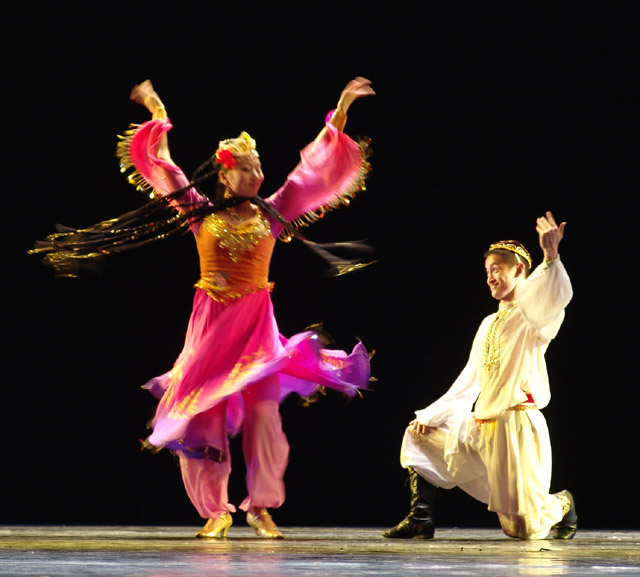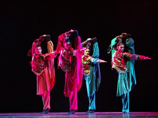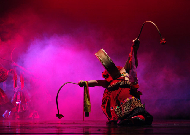 藏族男子群舞《离太阳最近的人》,黑黝黝的脸是太阳留下的潇洒,健美的臂膀挥赶着肥壮的牛羊,牧童的歌声在霞光中萦绕,伴随着太阳一同升起,离太阳最近的不是白云,是勤劳质朴的藏族人民。
