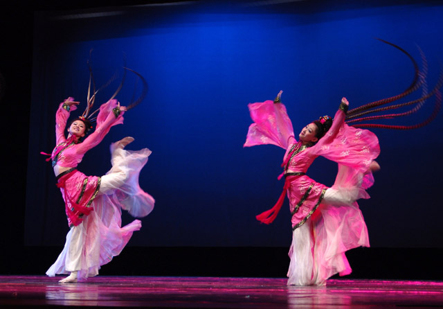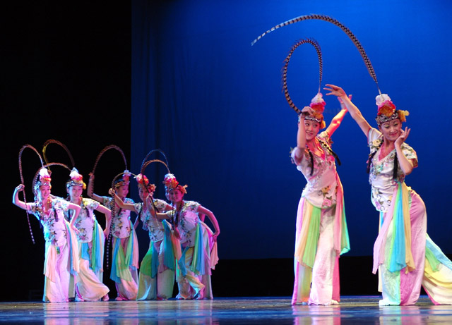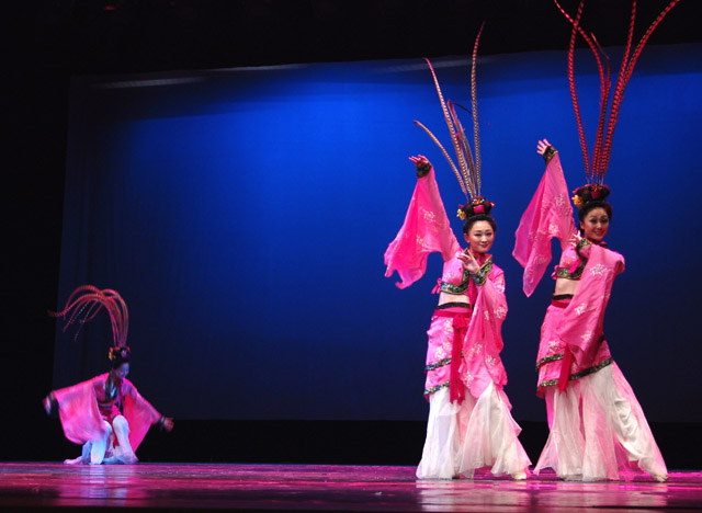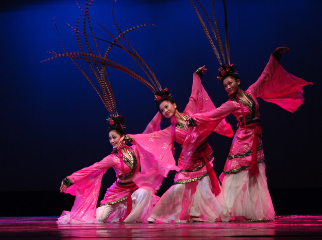 古典女子三人舞《楚腰》。相传先秦时候楚灵王好细腰,楚地女子以腰细为美,楚地又盛行巫风,婆娑歌舞,事神娱神也就成了楚人的“时尚”。