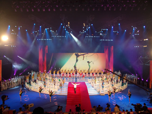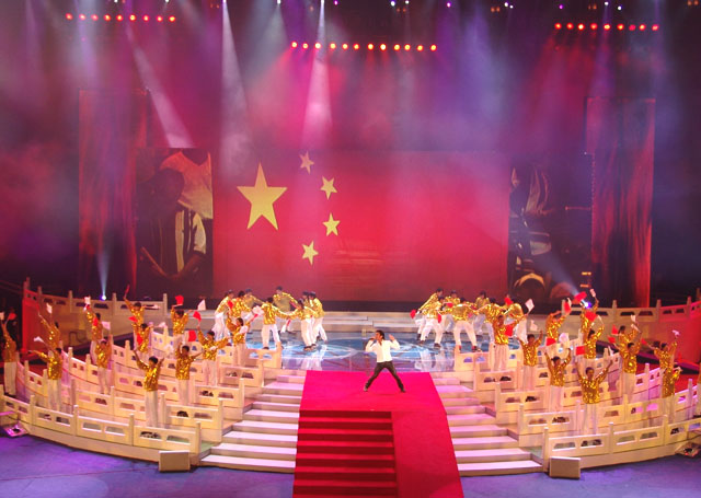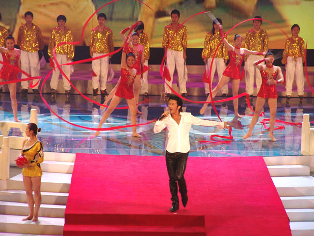 文艺演出的第四个节目是《为你荣光》,由香港著名歌星谢霆锋演唱歌曲,我校同学担任伴舞,其精彩的表演赢得了现场观众的阵阵欢呼。