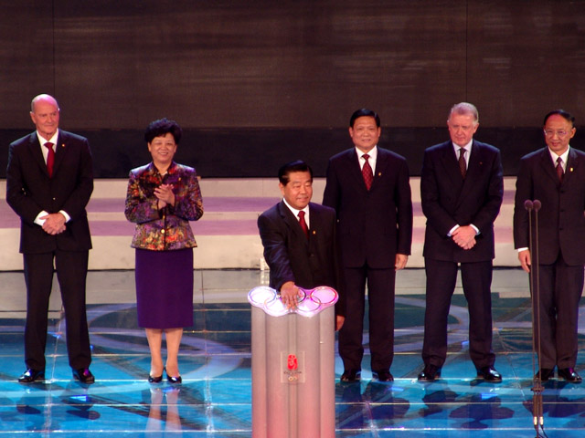 活动进入高潮,由中央政治局常委、全国政协主席贾庆林为2008奥运会吉祥物揭开神秘的面纱。