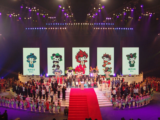 终于,万众期待已久的奥运吉祥物,五位可爱的奥运福娃——贝贝、晶晶、欢欢、迎迎、妮妮走出了后台,来到了亿万观众的面前,并立刻赢得了大家的热烈欢迎与格外好感。