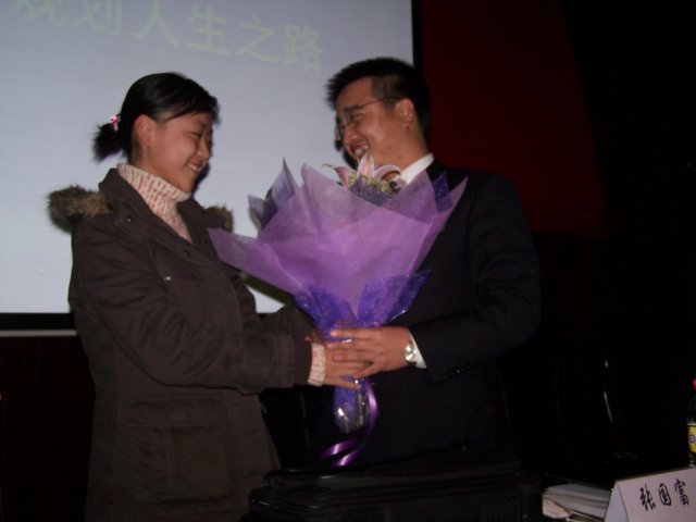 最后,活动主办方向两位嘉宾献花并赠送纪念品,活动圆满结束。这次活动的成功举行标志着管理与经济学院共产主义学习会主办的“访优秀国企、学先进党委”主题系列交流活动的圆满结束。这次活动在同学中产生较好的影响,也为我院的保持共产党员先进性教育活动增加了生动的一课。
