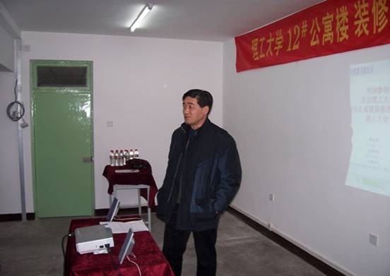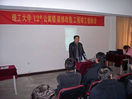 十二号学生宿舍楼装修改造工程由后勤办主持,巫后新主任为项目负责人。施工单位为北京建工四建工程有限公司第十九项目部。工程历时45天,经过一个多月的紧张施工,于近日顺利完工。经现场检查,参加验收的专家一致认为,该工程施工质量合格,同意通过验收。