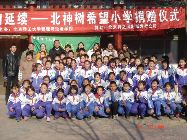 2005年即将结束,每个人都在为即将到来的新年而翘首期待。对于我校管理与经济学院青年志愿者协会的志愿者们和通州北神树希望小学的孩子们来说,这次新年将是与以往大不相同的一次。管理与经济学院青年志愿者协会于12月26日在北神树希望小学举办了为通州北神树希望小学捐赠书籍及体育用品的仪式。此次捐赠仪式为这个新年赋予了特殊的意义。